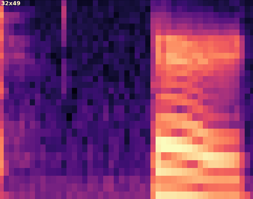 The following video shows a 1s audio sample being processed in increments of 400ms. So the ML model "sees" the same audio sample shifted by 400ms. 400ms is the simulated amount of time it takes the embedded device to generate the spectrogram and process it in the ML model. In this case, there are few predictions in the running average giving low confidence of a keyword detection.