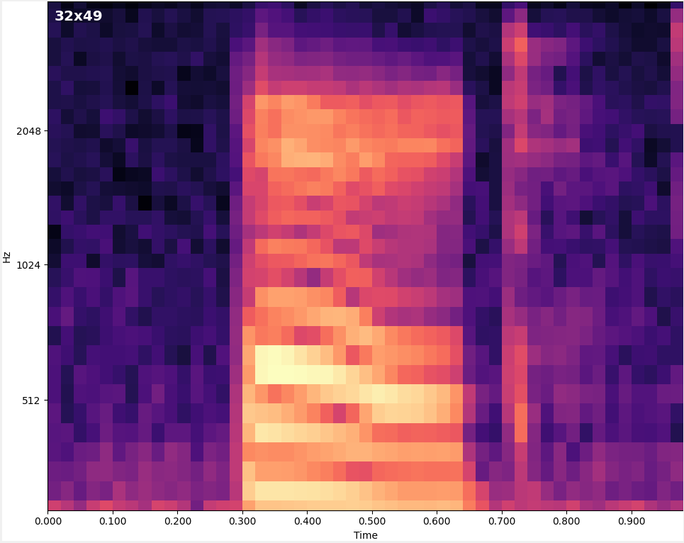 The following video shows a 1s audio sample being processed in increments of 100ms. So the ML model "sees" the same audio sample shifted by 100ms. 100ms is the simulated amount of time it takes the embedded device to generate the spectrogram and process it in the ML model. In this case, there are many predictions in the running average giving high confidence of a keyword detection.